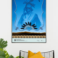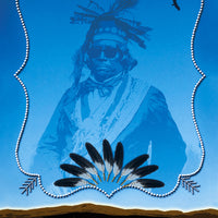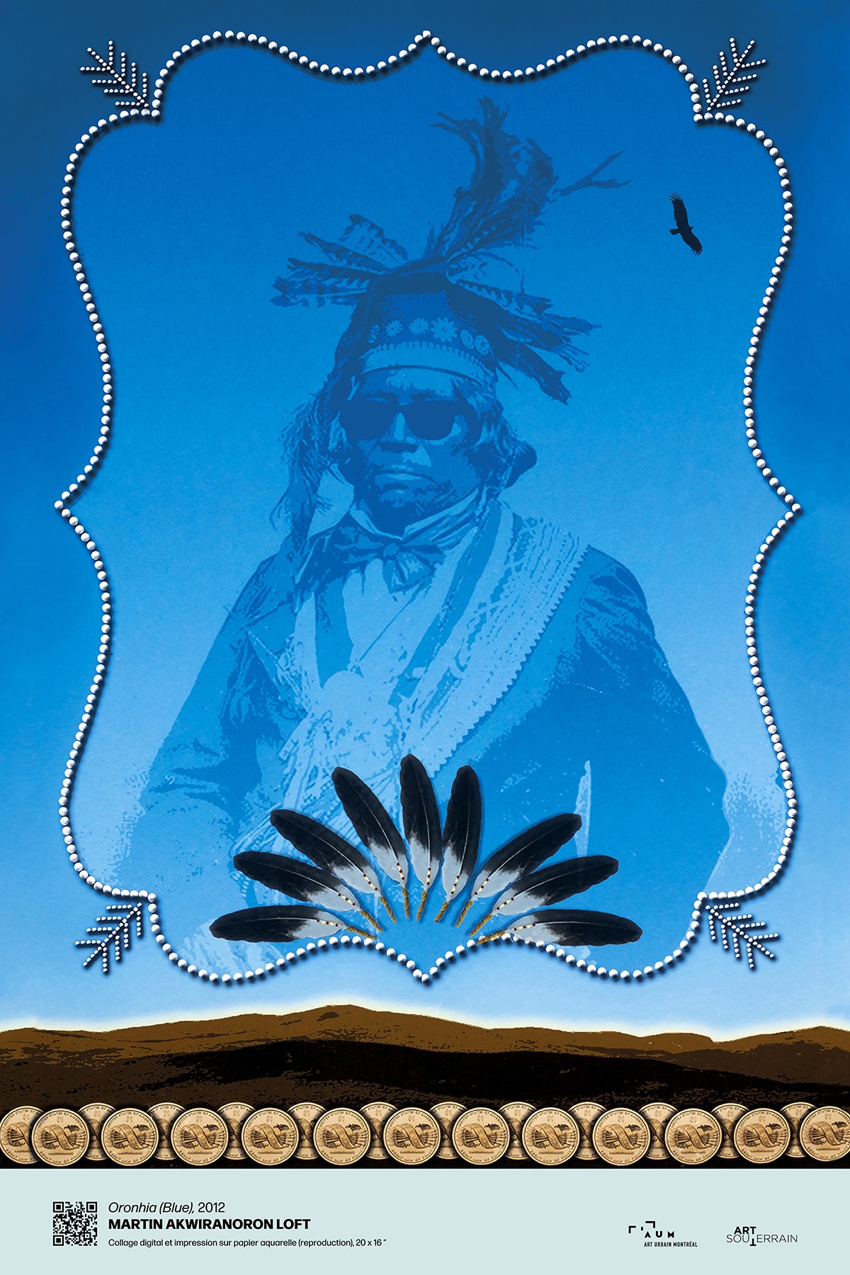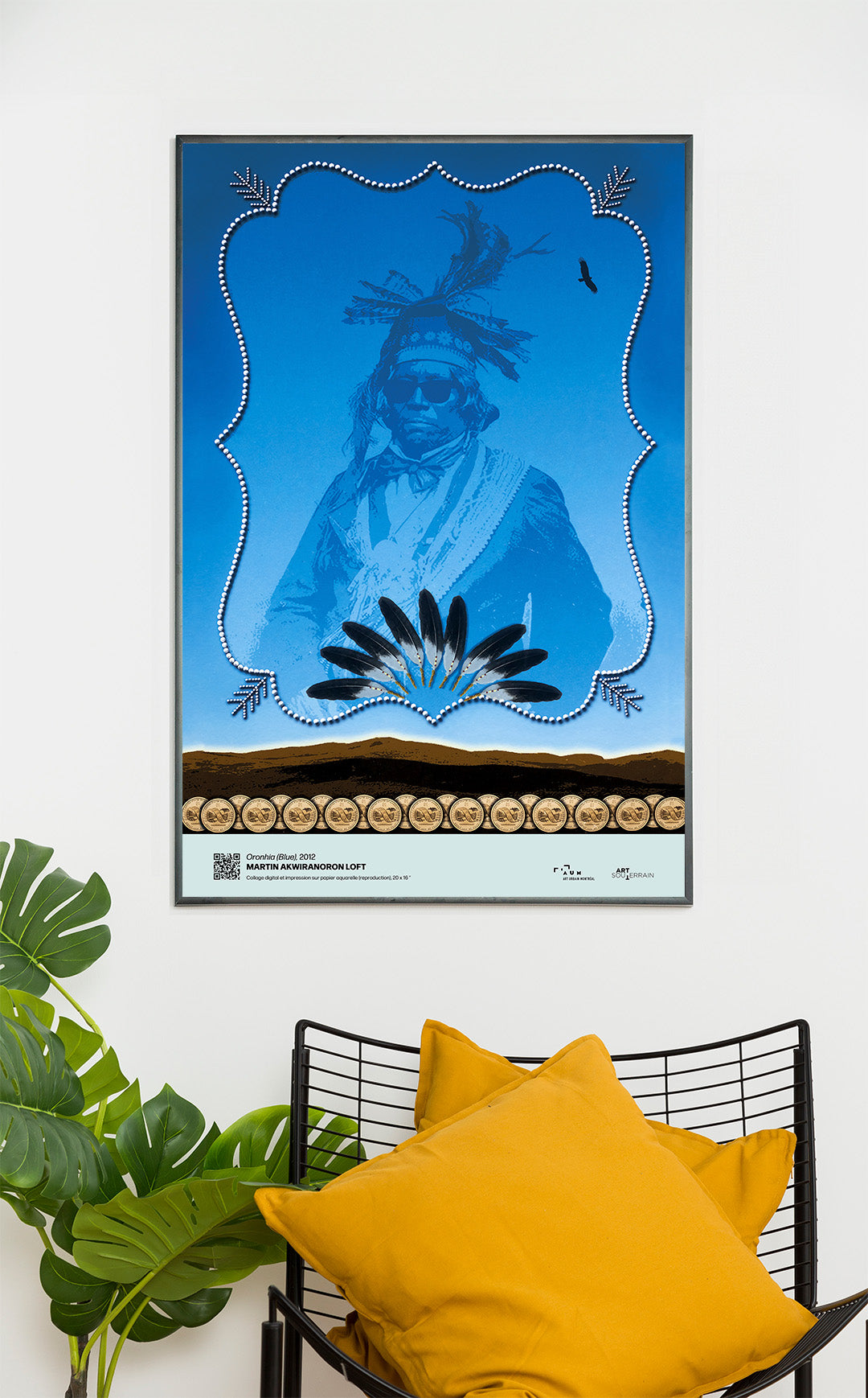 Martin Akwiranoron Loft's watercolor and digital collage print Oronhia (Blue) features a portrait of an unknown Kanien'kehá:ka chief surrounded by a Haudenosaunee beadwork frame. The soft, soothing blue sky overhangs the Adirondack Mountains, located in the traditional territory of the Kanien'kehá:ka, and accompanies the chief magnificently. This work reminds us that the protection of unceded native territories on Turtle Island is still guided by the ancestors, and that this struggle will continue for generations to come.